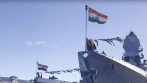 The tricolour is unfurled aboard INS Sahyadri and INS Kolkata in Australia’s Sydney. Both warships are participating in Exercise Malabar 2023. (Image: ANI) The tricolour
